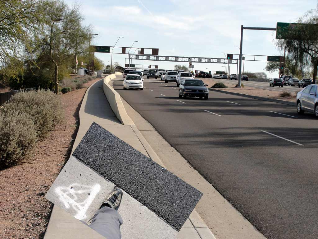 Elliot Road facing west picturing WB traffic coming from I-10 interchange (city of Phoenix). The inset shows the gutter pan is relatively wide (almost exactly 2 feet -- yes my shoes are about 1 foot each!) The lanes are something like 11'. This amount of space if often wrongly perceived by motorists as sharable side-by-side. I think EB is similarly annoying; possibly worse because if i remember correctly there is no RTO lane to enter I-10 eastbound, and this sets up overtaking/right hook problems. Ray/I-10 and Warner/I-10 is set up with nice narrow lanes. Chandler/I-10 is set up with nice wide lanes. Elliot/I-10 is a bastard. Neither fish nor fowl. (speaking only of the Phoenix/West side of I-10). | ![]() |