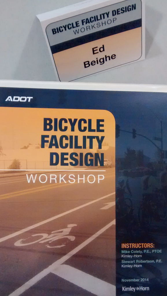 Attended an all-day Bicycle Facility Design Workshop on Nov 20, 2014. Thanks to Mike Sanders and ADOT for putting this on.